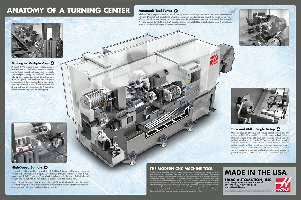 Created for Haas Automation, Inc. This 3-D cut-away is accompanied by four tertiary renders, depicting the elements which create a turning center C.N.C. machine.
